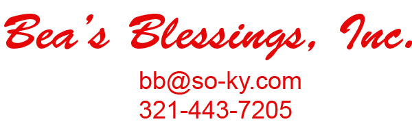 This site is under construction and will be updated soon. Bea's Blessings is a non-profit in memory of Bea Green (1946-2015) Our goal is to help others. We will donate to Churches, Missionaries, People in need and other worthy causes. We currently donate to: Connection Church, Kissimme, FL; Glasgow Cumberland Church, Glasgow, KY, Galilean Children's Home, Liberty, KY; Justin & Shelby Fiechter, Impact Africa; Mission of Hope, Haiti. We are self funded but would welcome your giving through us or to one of our causes. More soon.....